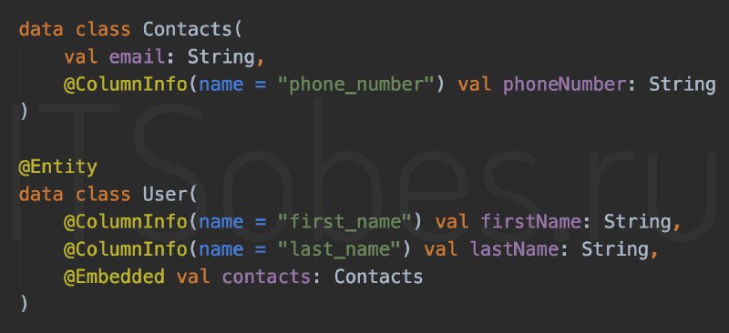 @Embedded используется на полях Entity и позволяет включить объект непримитивного типа в таблицу. При этом для каждого поля Embedded-класса создается колонка в таблице.