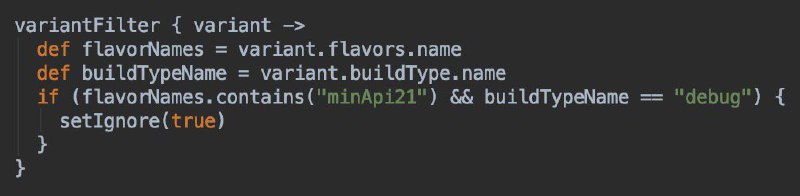 variantFilter позволяет проитерироваться по возможным build-вариантам, проверить имена flavors и build-типа для каждого варианта и проигнорировать неиспользуемые build-варианты с помощью метода