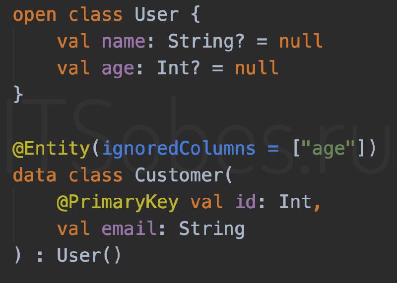 Для полей, унаследованных из родительского класса, также создаются колонки таблицы. Чтобы проигнорировать родительское поле в классе-наследнике, используется атрибут ignoredColumns аннотации @Entity.
