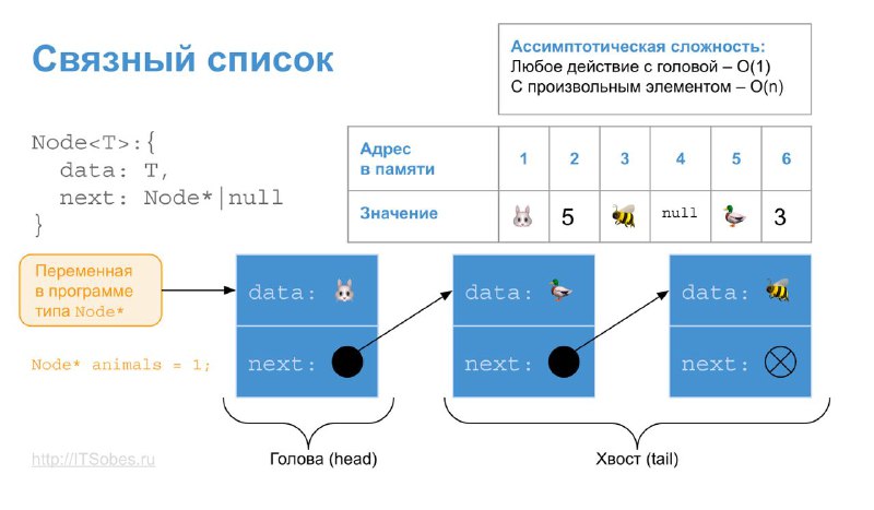 Сложность поиска по значению и по индексу – линейная; любых действий с головным элементом – константная. Ранее найденный элемент модифицируется за константное время даже в середине.