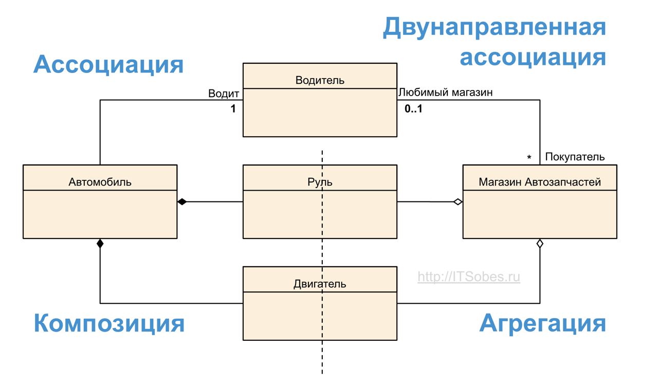 Ассоциация – знание одного класса о другом. Например, класс Начальник может быть связан с классом Подчиненный отношением ассоциации, чтобы передавать ему запросы. Если и Подчиненный должен обращаться к Начальнику – ассоциация называется двунаправленной.
