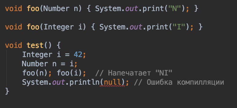 Если в классе объявлены два перегруженных метода, а аргумент в вызове подходит под оба, случится ошибка компиляции. В примере ниже компилятор не может выбрать между вариантами метода println с параметром char[] и со String, так как null может быть и тем и другим.