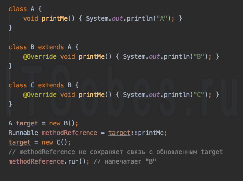 позднее связывание. По этой причине, когда мы обращаемся к такому методу по ссылке, то получаем метод