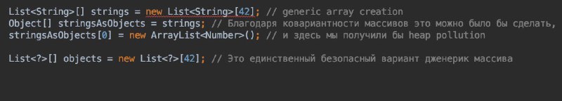 Параметризованный тип varargs-аргумента метода вызывает ту же проблему, т.к. varargs – не что иное как параметр-массив. Вот почему он так же приводит к предупреждению компилятора «possible heap pollution». Если вы уверены что риска нет, с Java 7 это предупреждение заглушается аннотацией