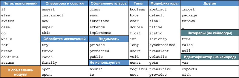 3. 10 ограниченных ключевых слов (restricted keywords). Они считаются ключевыми словами только в контексте файла объявления модуля module-info. В обычных .java-файлах это разрешенные идентификаторы.