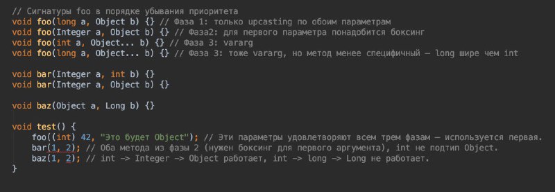 1. Методы, в которые переданные параметры подходят по типу либо как есть, либо с применением расширения (upcasting)