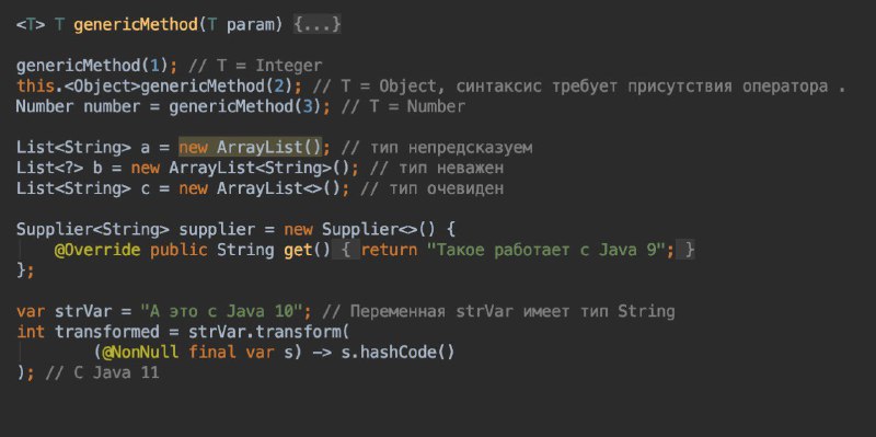 Типы выводимых параметров лямбда-выражения также можно не указывать. С Java 11 вместо типа указывается ключевое слово