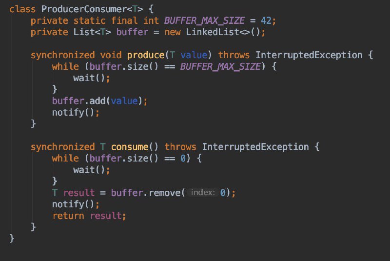 Общий вид решения выглядит так. Продюсер отправляет объекты в специальную коллекцию – буфер. Когда потребитель освобождается, он отправляет запрос на извлечение одного объекта из буфера. Если буфер пуст, потребитель блокируется и ждет, если буфер переполнен – ждет производитель.