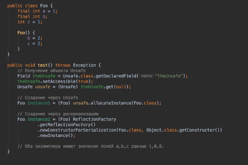 Unsafe.allocateInstance – непосредственно создает экземпляр не вызывая конструктор, ничего лишнего.
