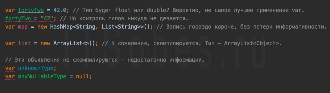 var в полях класса, параметрах метода, и где-либо еще кроме локальных переменных. Во-вторых, обязана быть инициализация с понятным типом – варианты