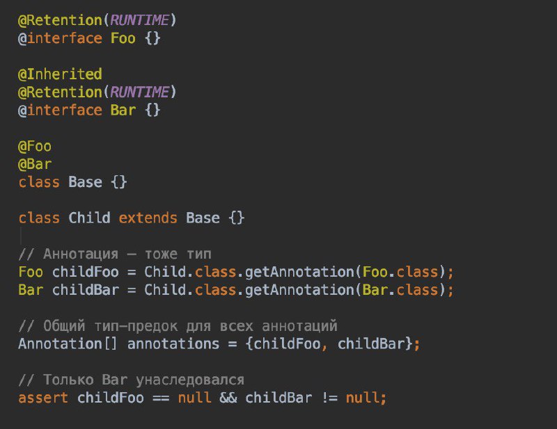передается ли аннотация класса-родителя классу-наследнику, ответ – по умолчанию нет. Но наследование можно включить, если на объявлении аннотации поставить мета-аннотацию
