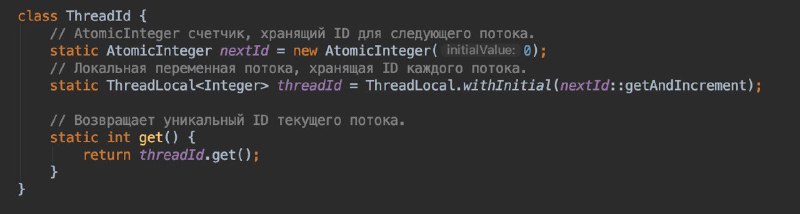 Первый, самый очевидный вариант использования – данные, относящиеся непосредственно к треду, определенный пользователем «контекст потока». На скриншоте ниже пример такого использования: ThreadId.get() вернет порядковый номер текущего треда.